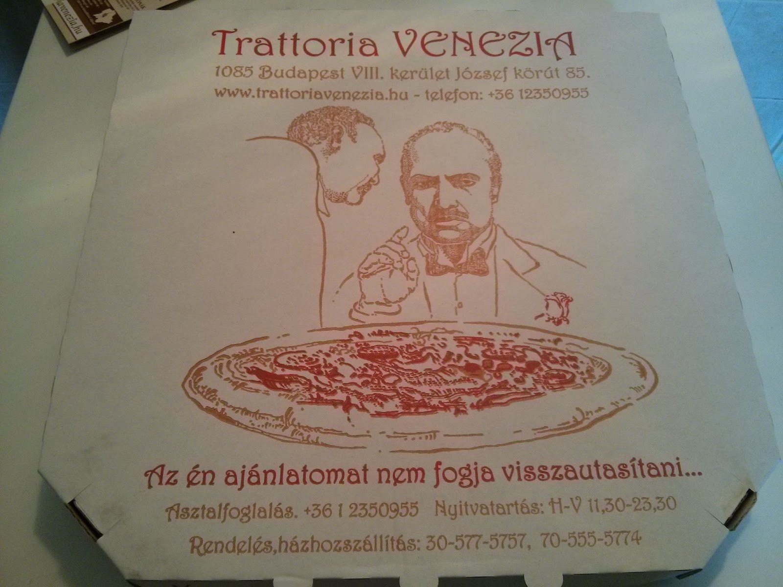 Már régóta tervezek kipróbálni egy drágább pizzát, hogy megtudjam, valóban minőségibb, „olaszosabb” kaját kapok-e, ha több pénzt szánok rá. Az utolsó pillanatban azonban mindig inkább egy már bevált, olcsó étterem mellett döntöttem, de most elhatároztam, hogy mindenképpen a Trattoria Veneziából fogok rendelni. A Fumé pizzát választottam, amin füstölt sajt, olasz, göngyölt bacon illetve parmezán a feltét. Mindez 2200 forintba kerül, de mivel a XI. kerületben lakom, ezen felül még fizethetek 300 forintot a kiszállításért. Ez volt az a pillanat, amikor nem sokon múlott, hogy inkább másik étterem mellett döntsek. Manapság már egy csomó pizzázó ingyen áthozza akár az egész városon a pizzát, ők pedig elkérnek 300 forintot nem egészen 3 kilométerért?! Na mindegy, szóval 2500-ba kerül az ebédem, ehhez mérten elég szigorú is leszek az értékelésekor.